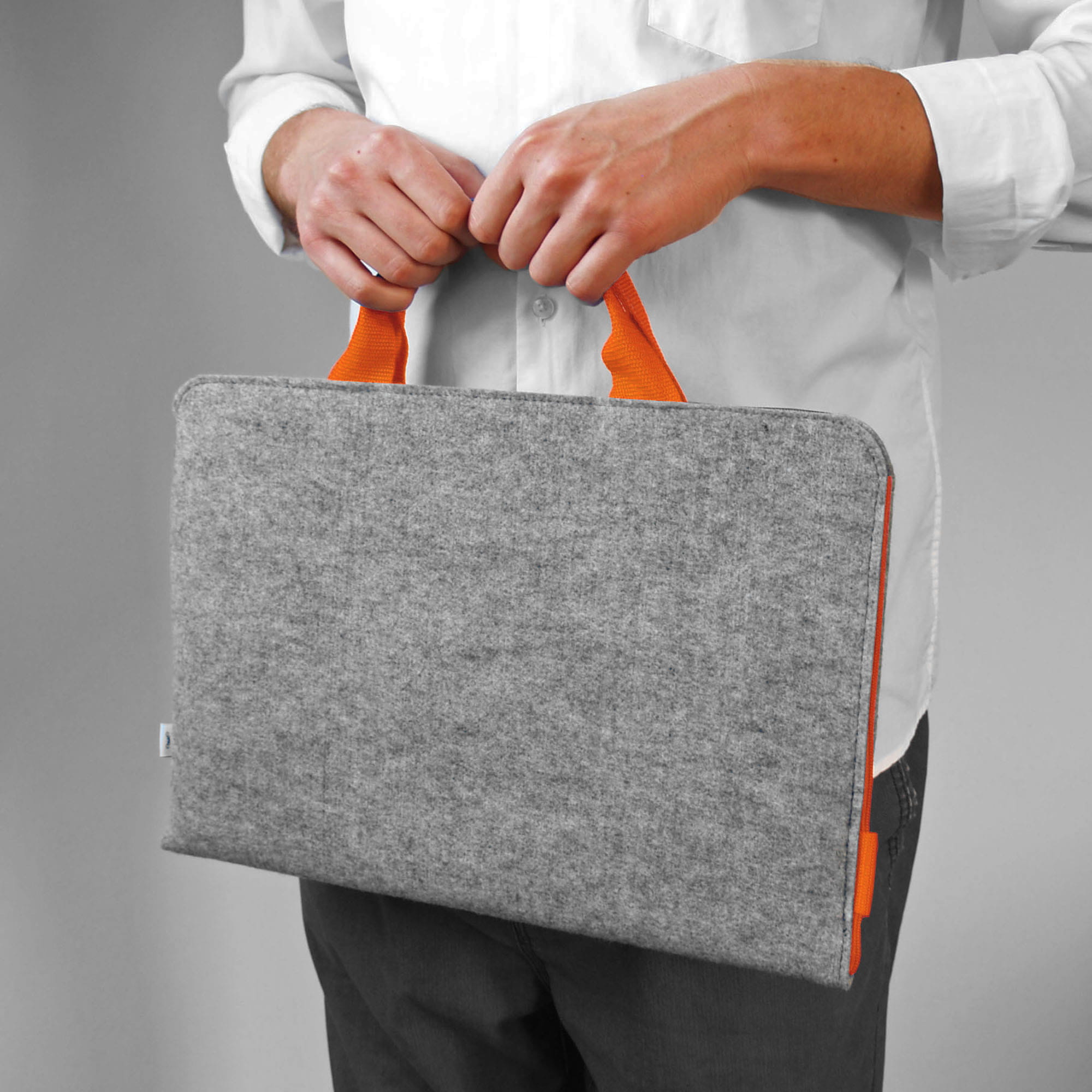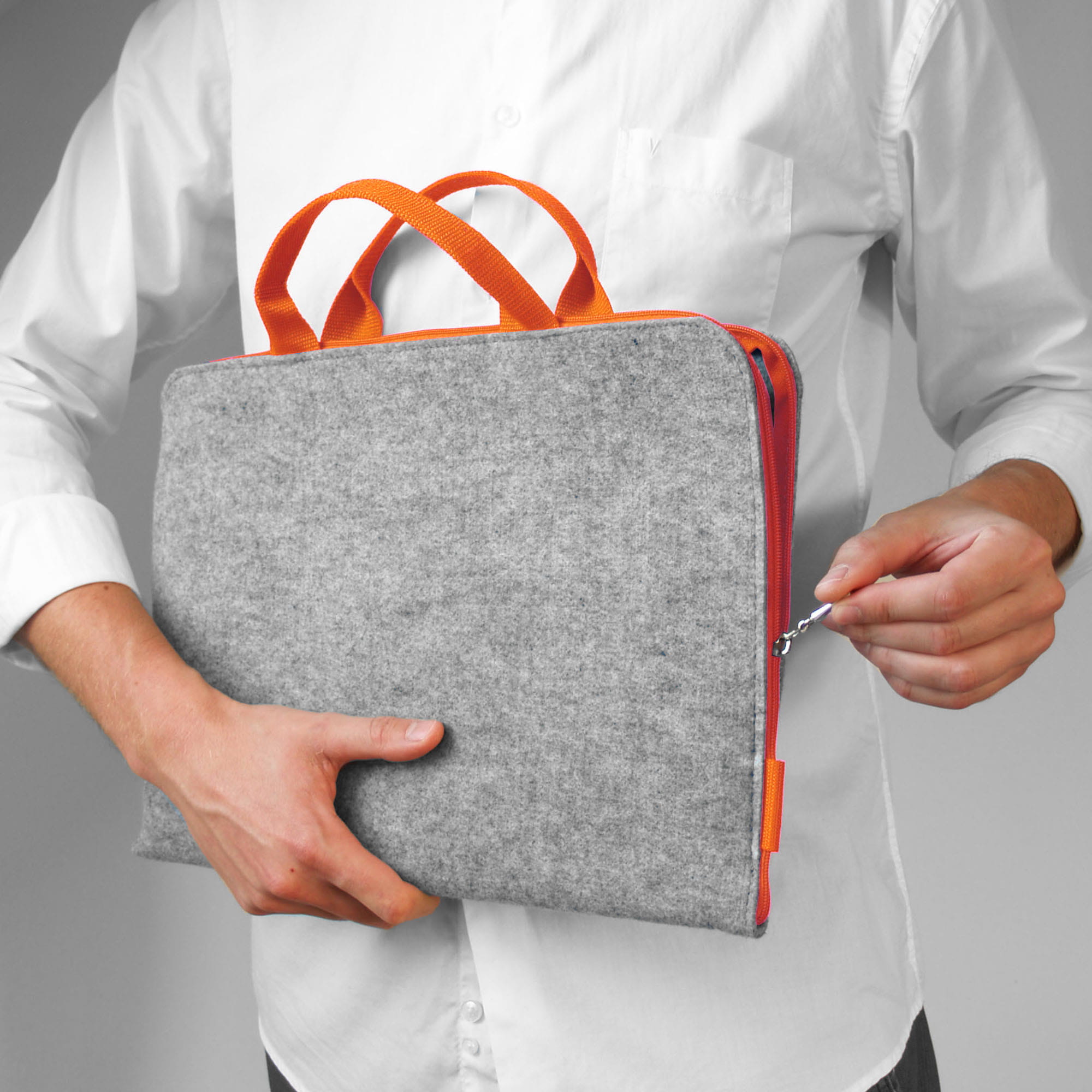 Ręcznie wykonane etui z jasnoszarego filcu - pomarańczowe rączki i zamek.
